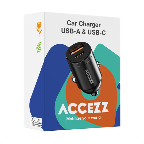 Accezz - Chargeur de voiture | Charge rapide avec 2 ports - USB-A 30 watt + USB-C 65 watt - Black