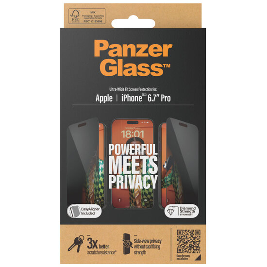 PanzerGlass - Privacy Ultra-Wide Fit Anti-Bacterial Screenprotector incl. applicator voor Apple iPhone 15 Pro Max - Transparent
